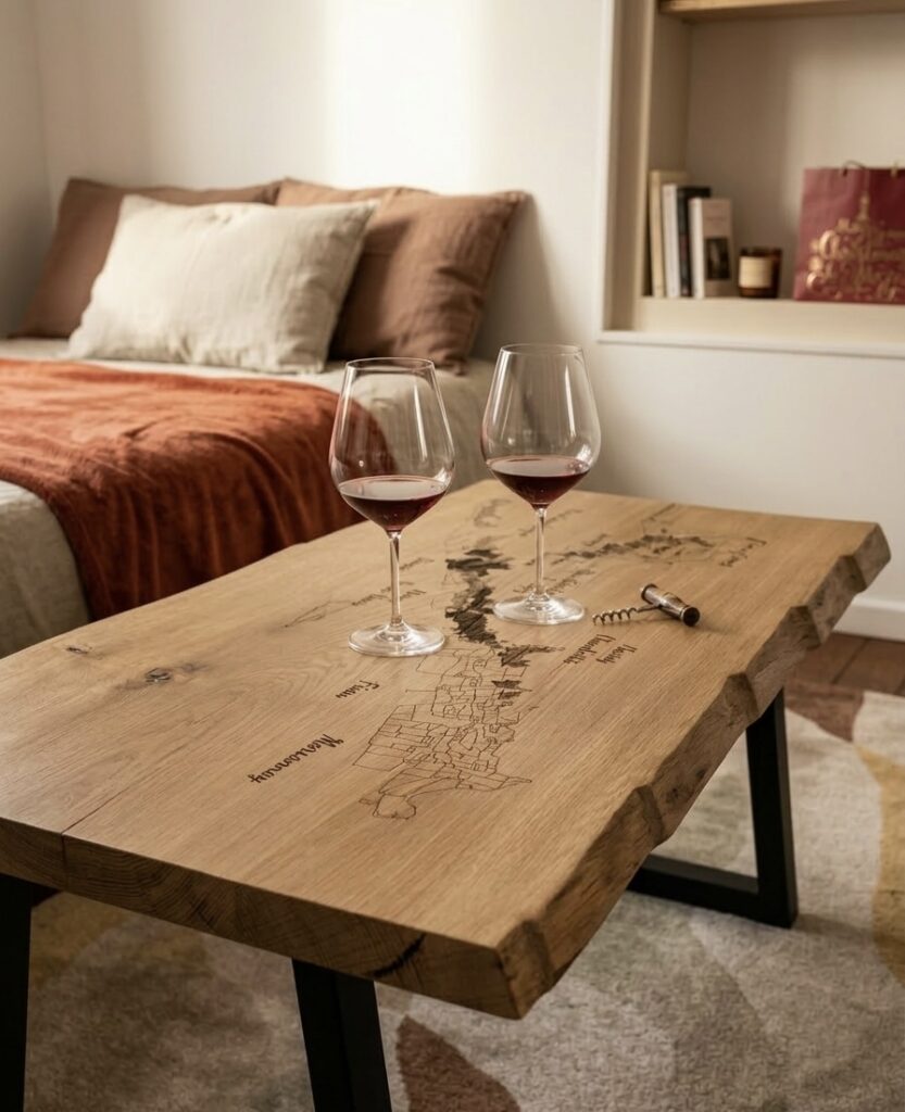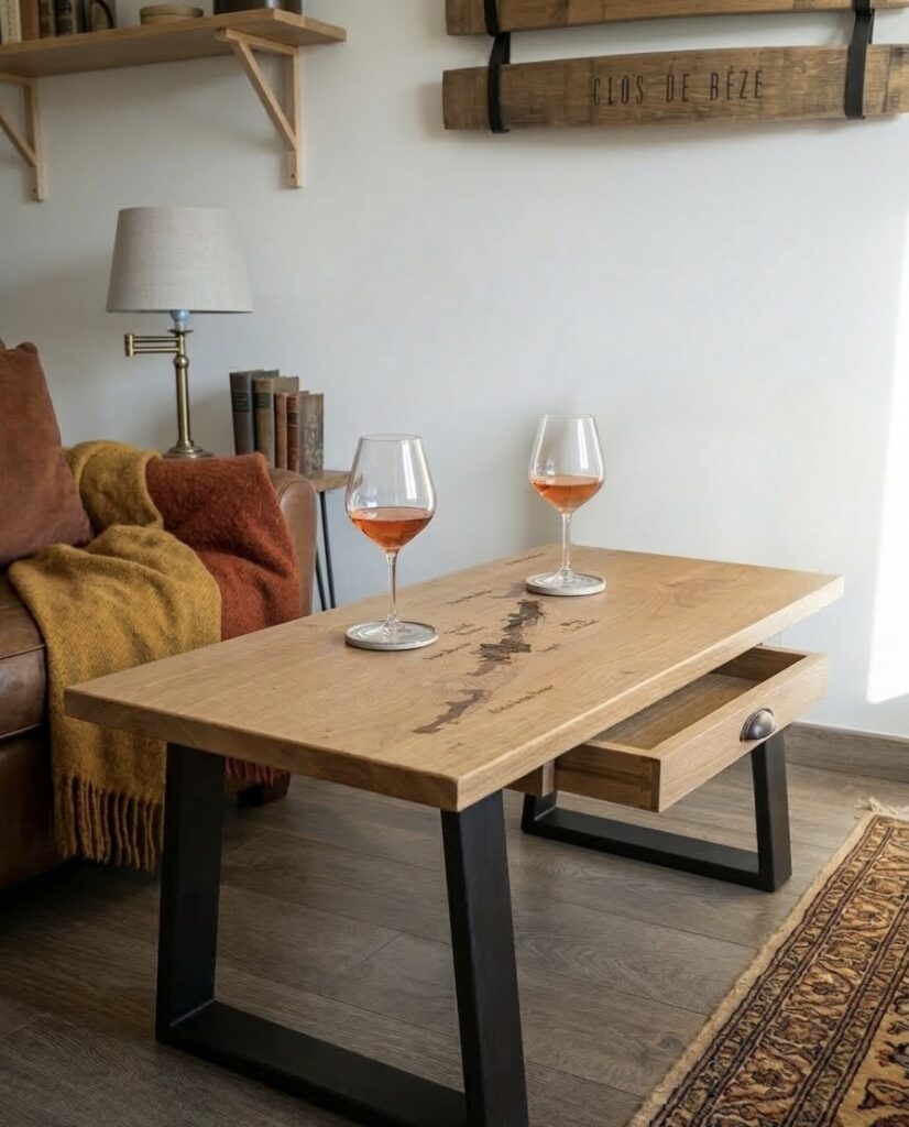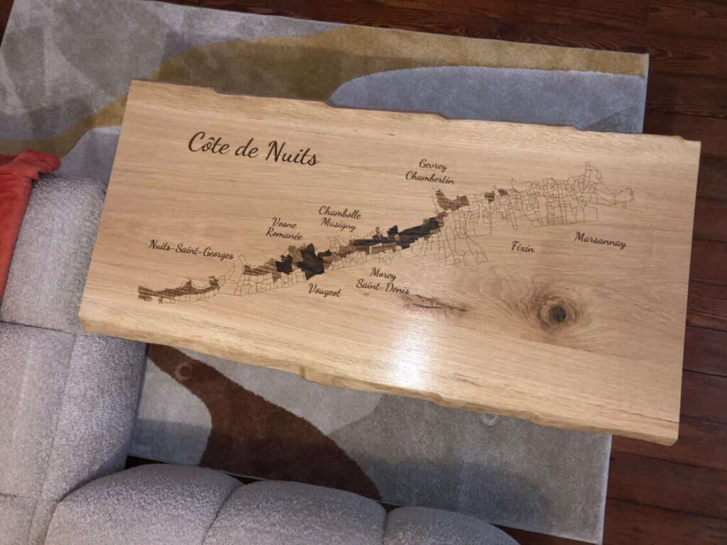 Ici, plusieurs exemples de table en chêne massif aux dimensions conventionnelles ; 100x50cm, avec selon vos envies des bords naturels ou droits, un tiroir ou non, et surtout une gravure viticole qui ira avec vos goûts ; le plus difficile c’est de choisir !