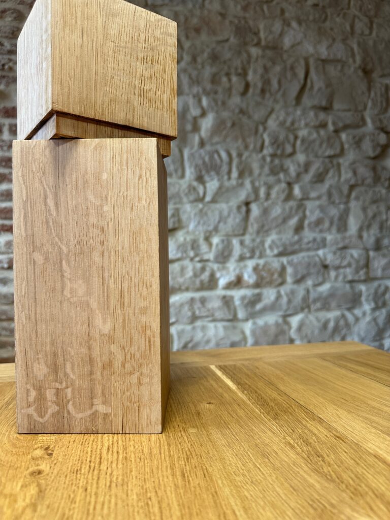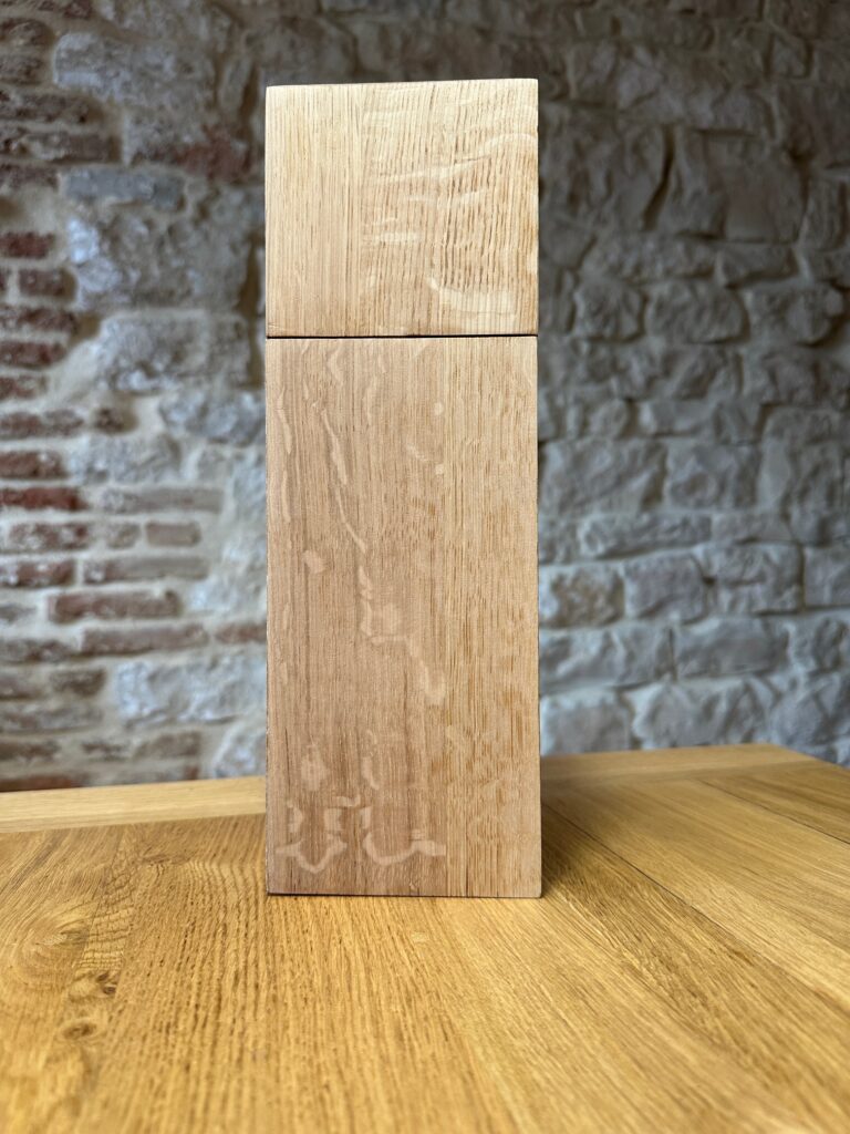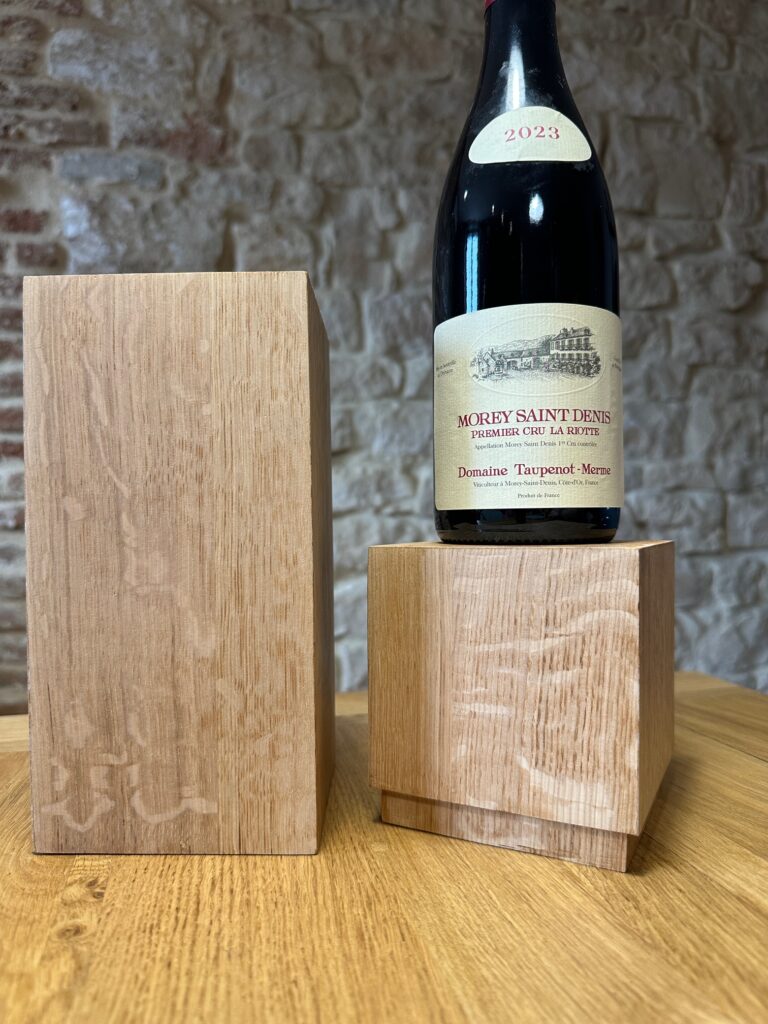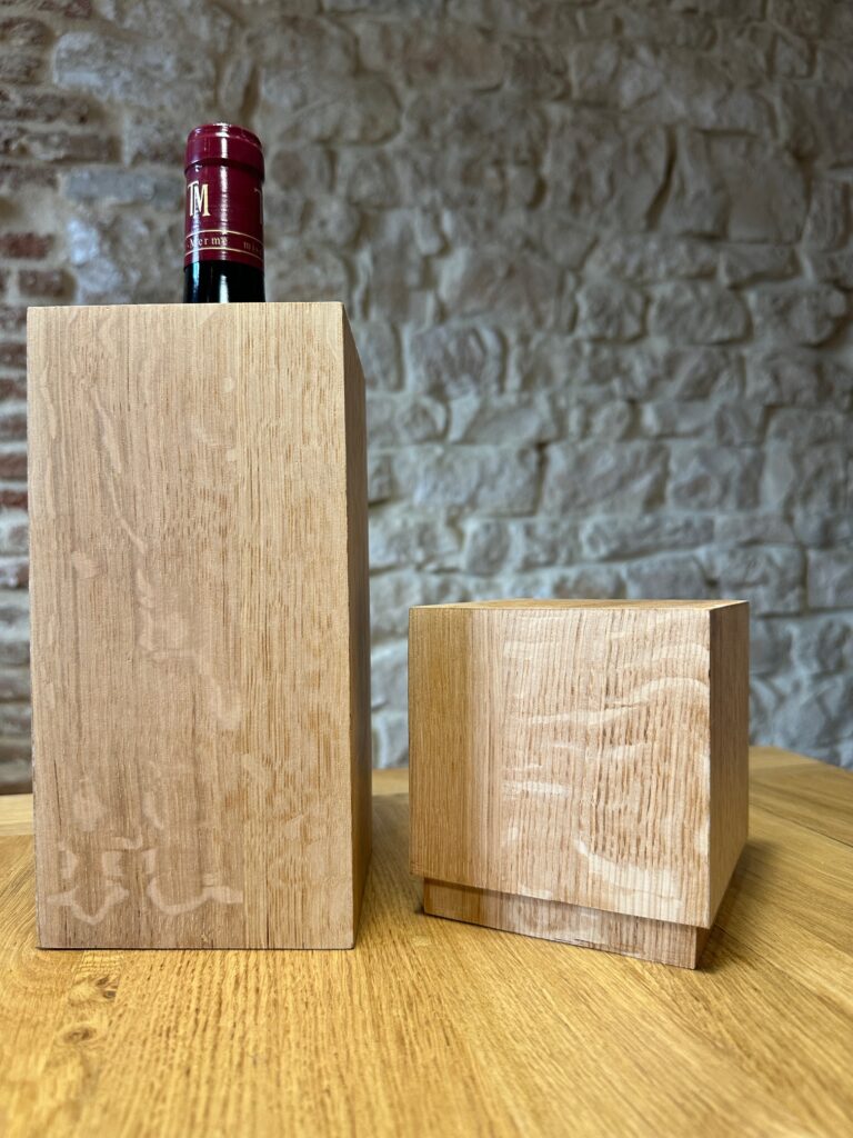 Parfois, les choses simples visuellement ne sont pas toujours les plus faciles techniquement… Ici, un coffret en chêne pouvant contenir une bouteille mais en ayant de visible que du bois de fil. Que des coupes d’angles donc, avec une harmonie parfaite entre le coffret et la précieuse bouteille à contenir. Encore une fois ici, la personnalisation du visuel est à définir selon vos envies !