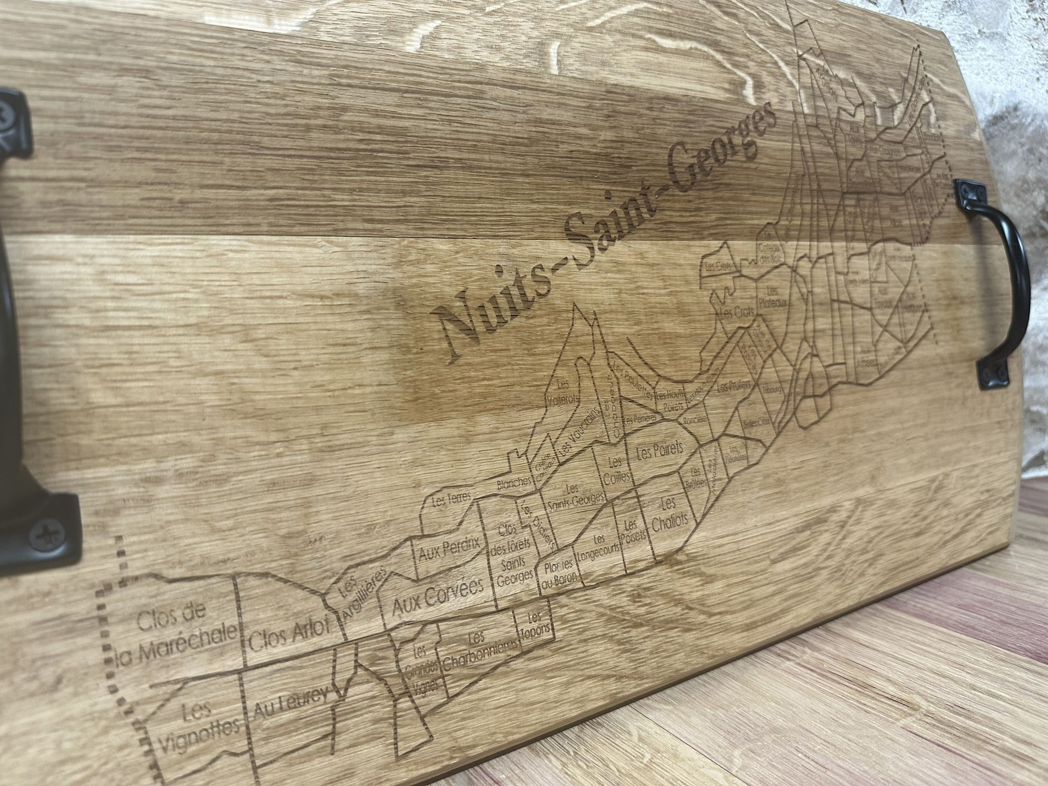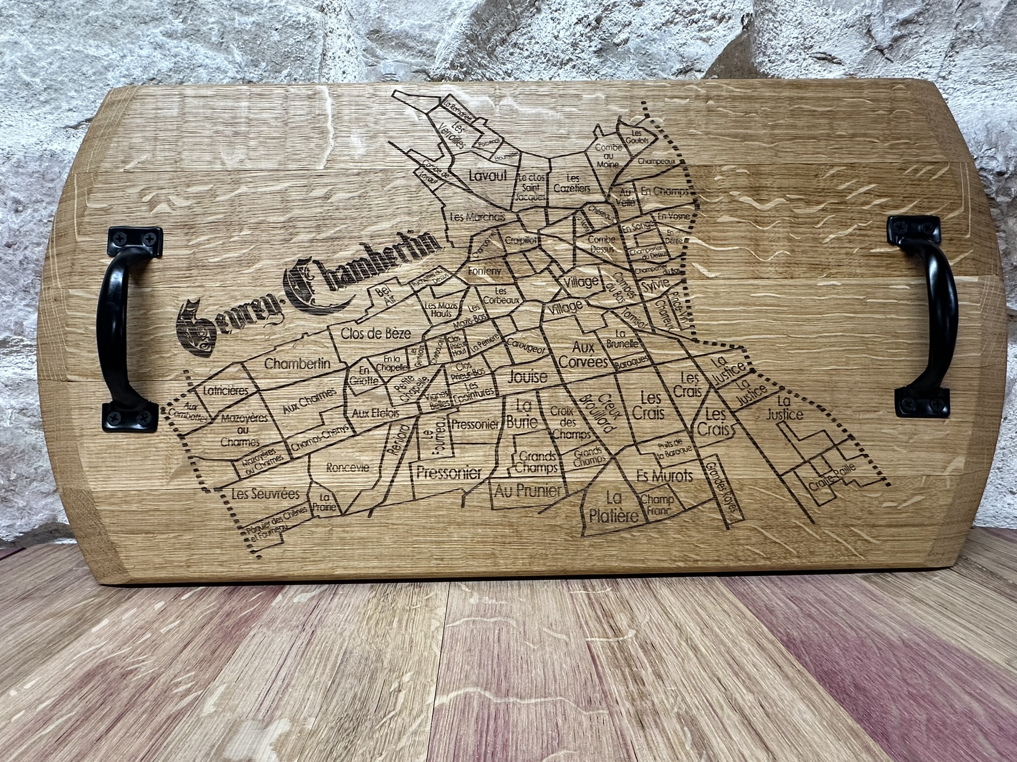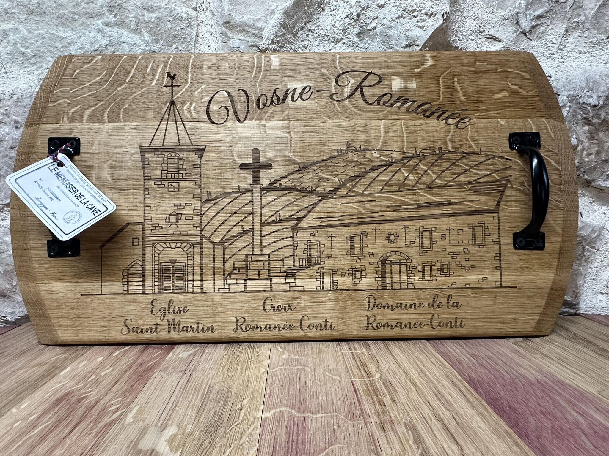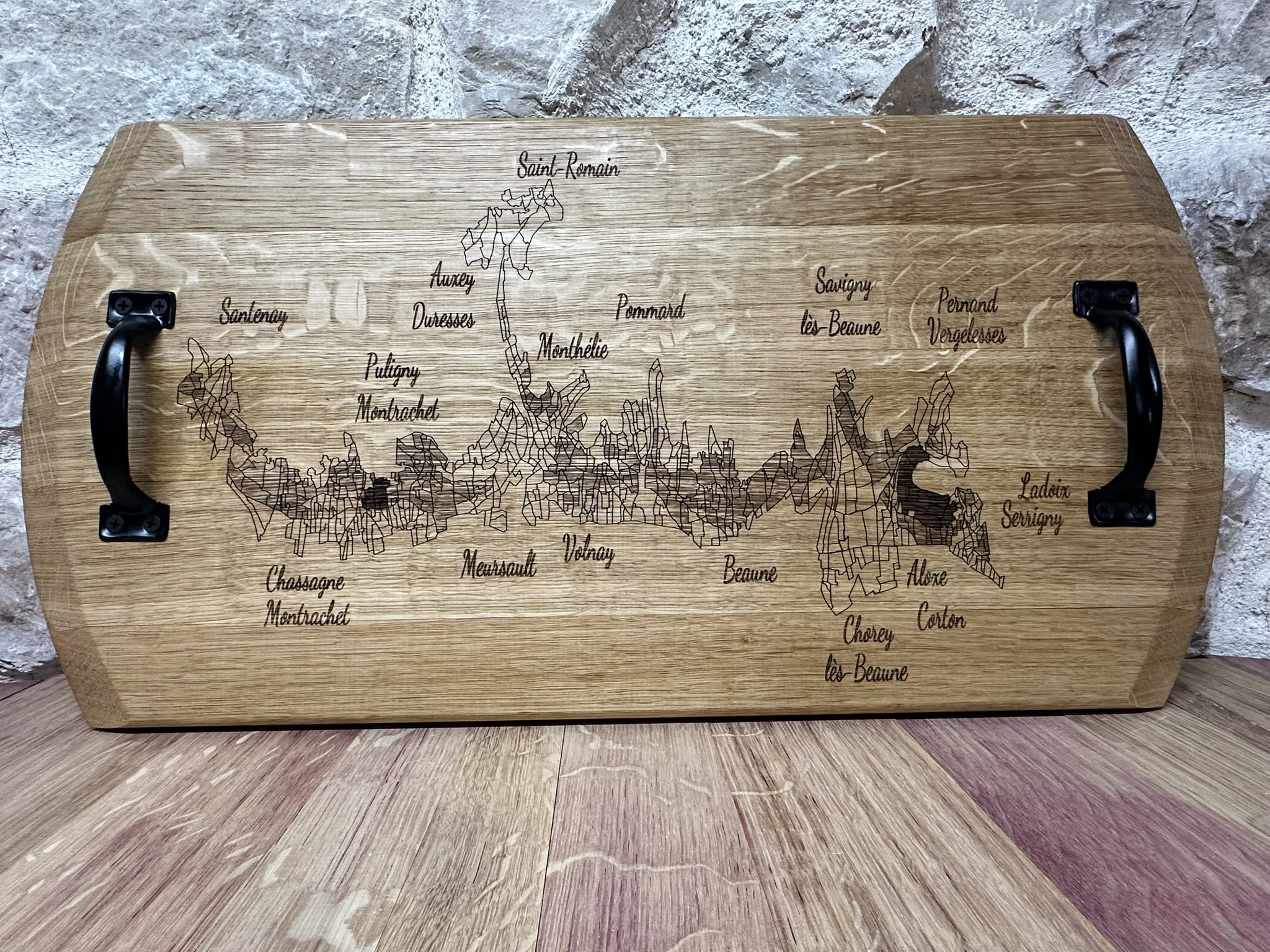 Ici, la planche XXL est entièrement réalisée en chêne à partir d’un fond de tonneau neuf. 60cm de long pour 30 de haut. 2 poignées métalliques pour assurer un bon maintien. Comme pour l’ensemble des produits proposés, la personnalisation est tout à fait possible, selon vos envies.