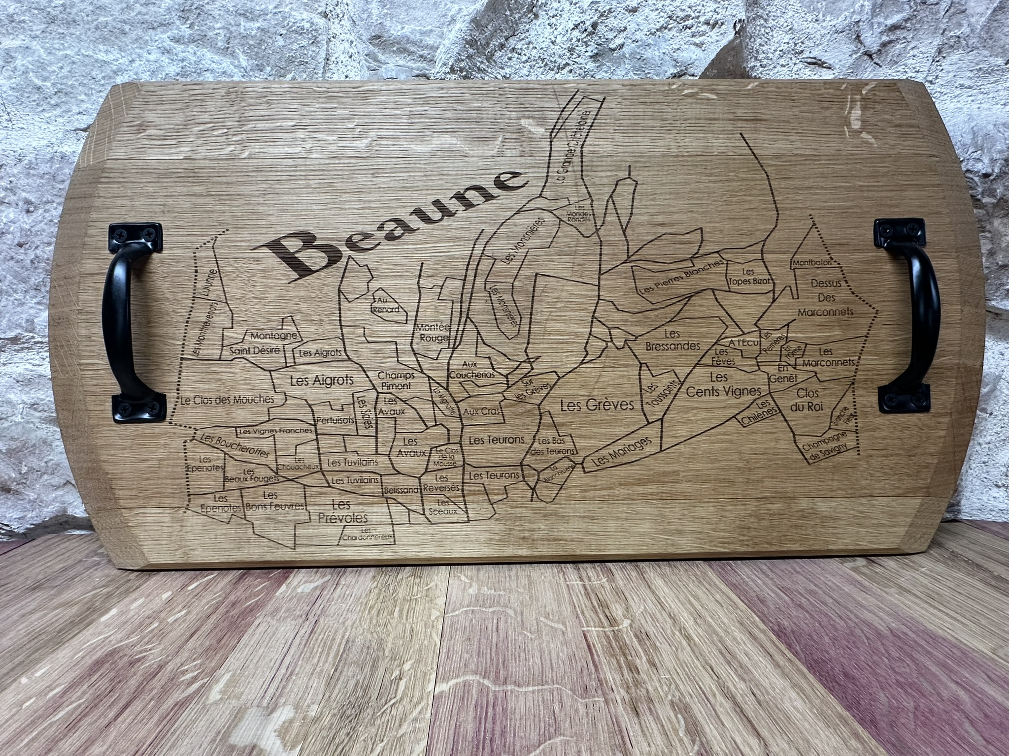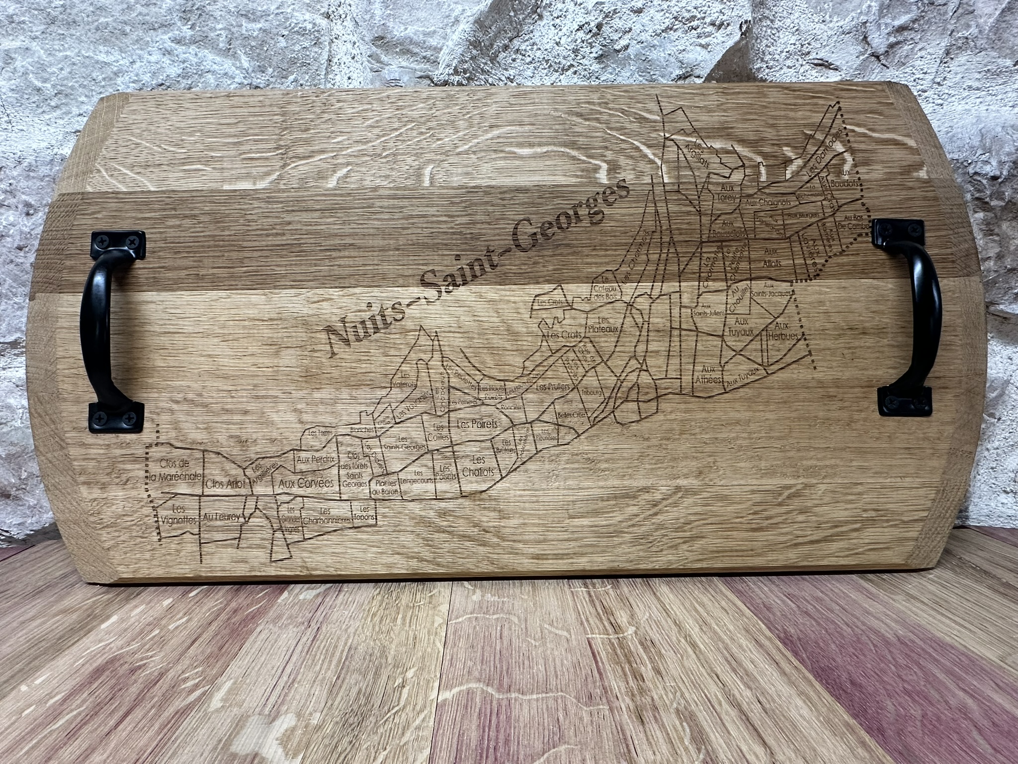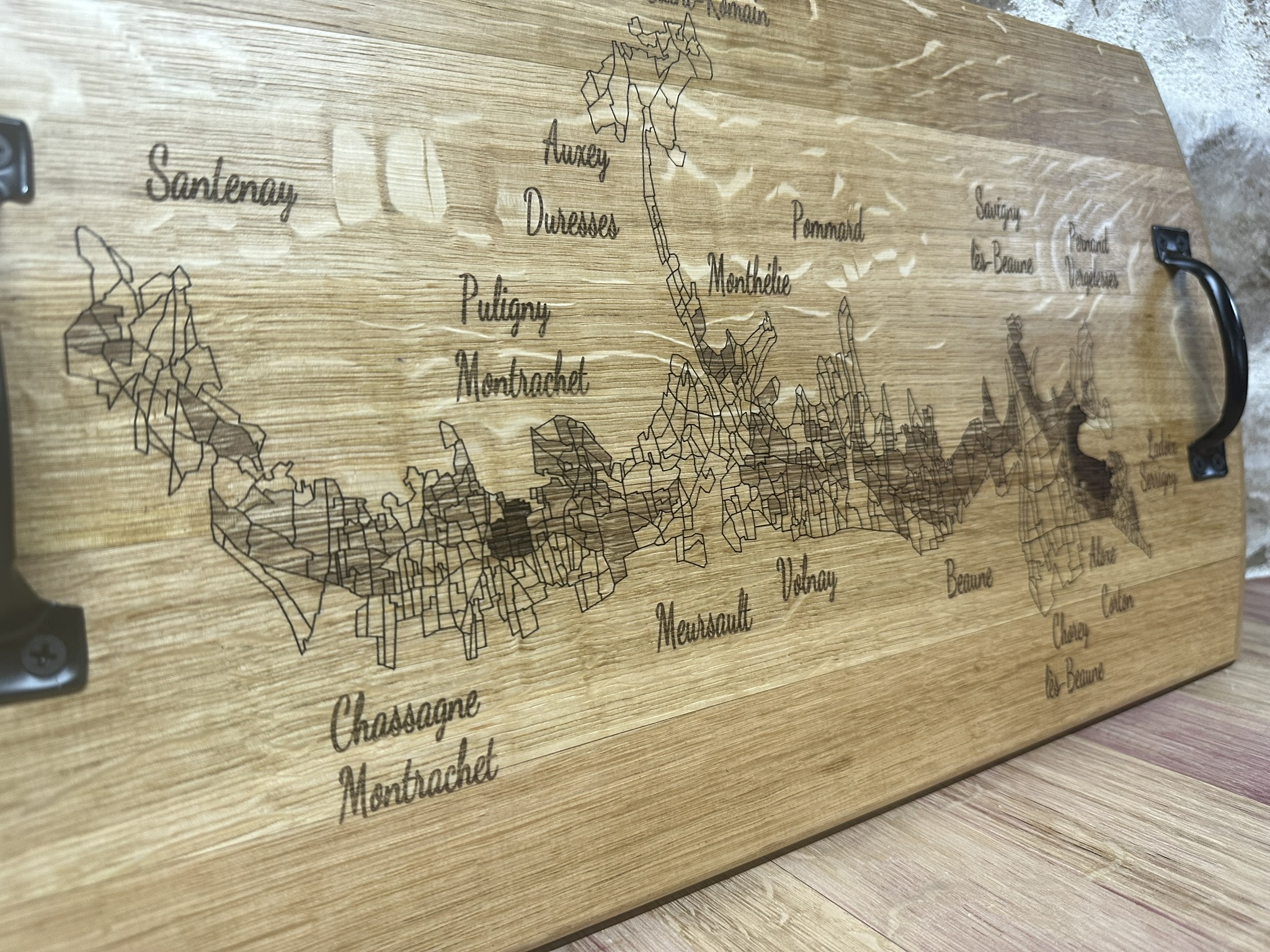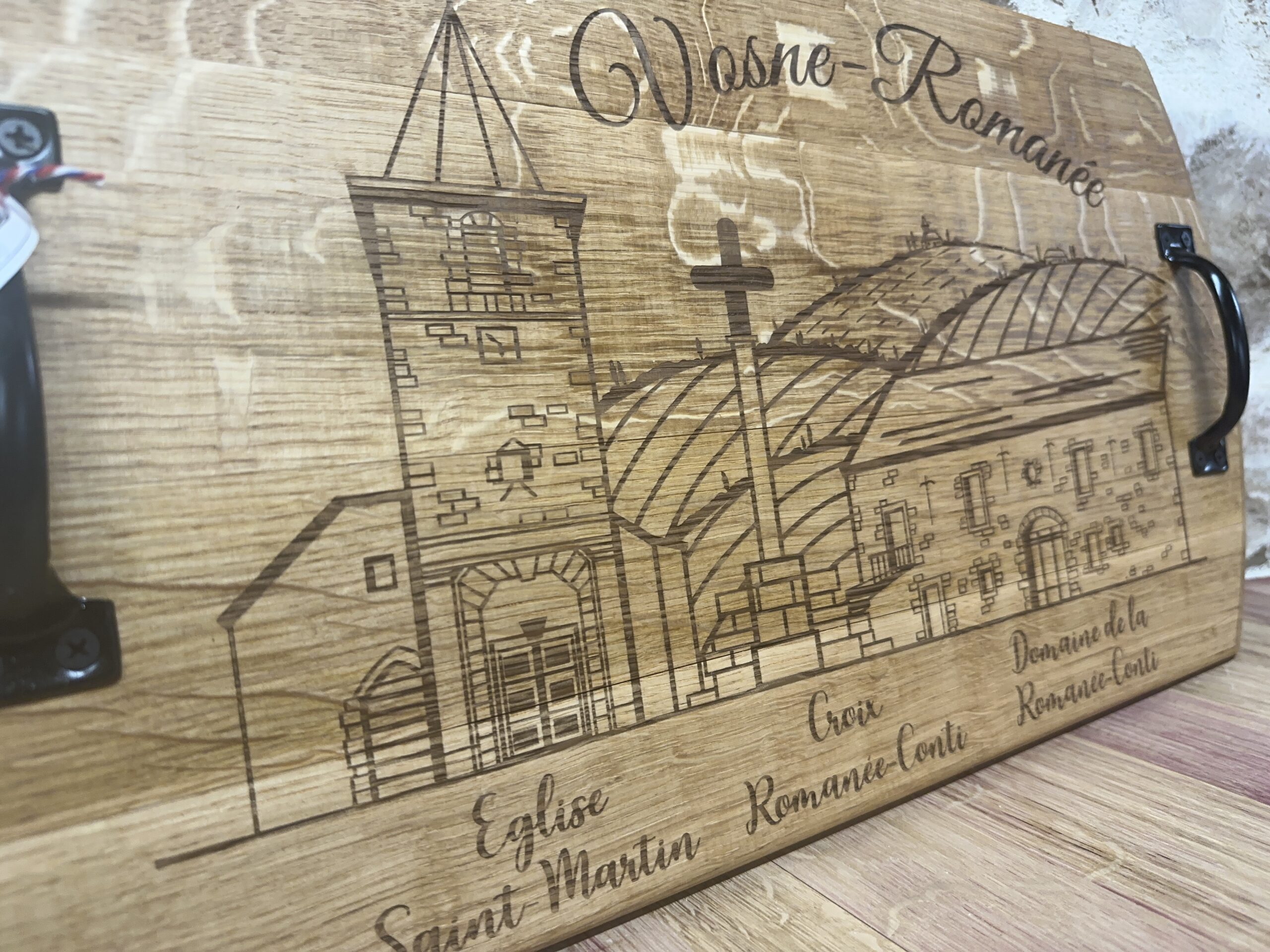Ici, la planche XXL est entièrement réalisée en chêne à partir d’un fond de tonneau neuf. 60cm de long pour 30 de haut. 2 poignées métalliques pour assurer un bon maintien. Comme pour l’ensemble des produits proposés, la personnalisation est tout à fait possible, selon vos envies.