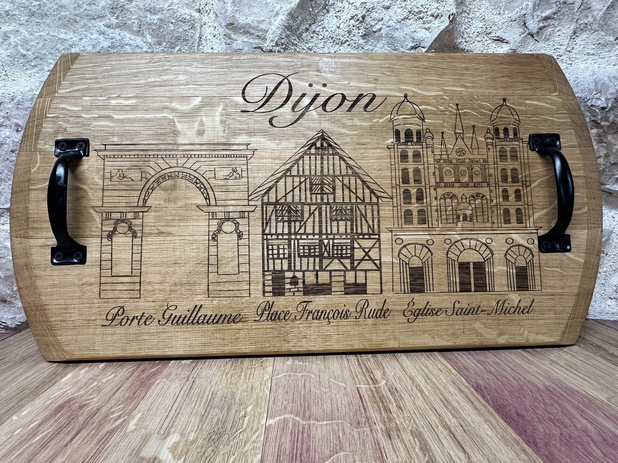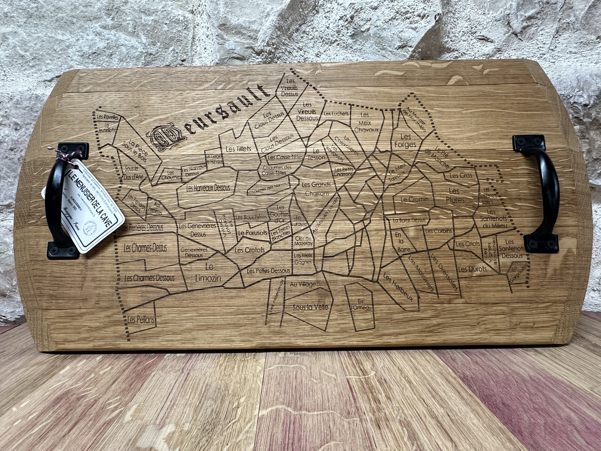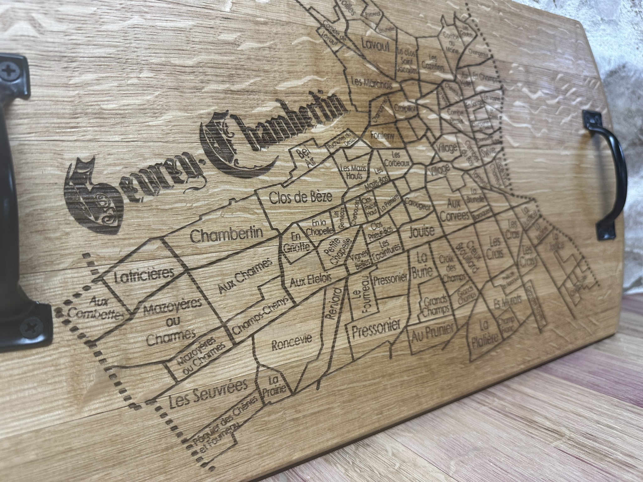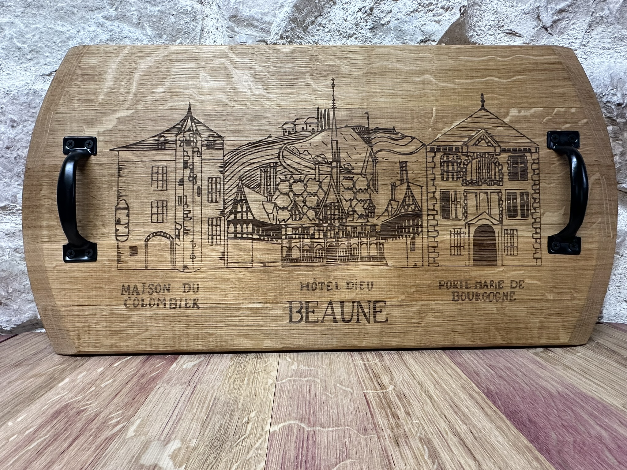 Ici, la planche XXL est entièrement réalisée en chêne à partir d’un fond de tonneau neuf. 60cm de long pour 30 de haut. 2 poignées métalliques pour assurer un bon maintien. Comme pour l’ensemble des produits proposés, la personnalisation est tout à fait possible, selon vos envies.
