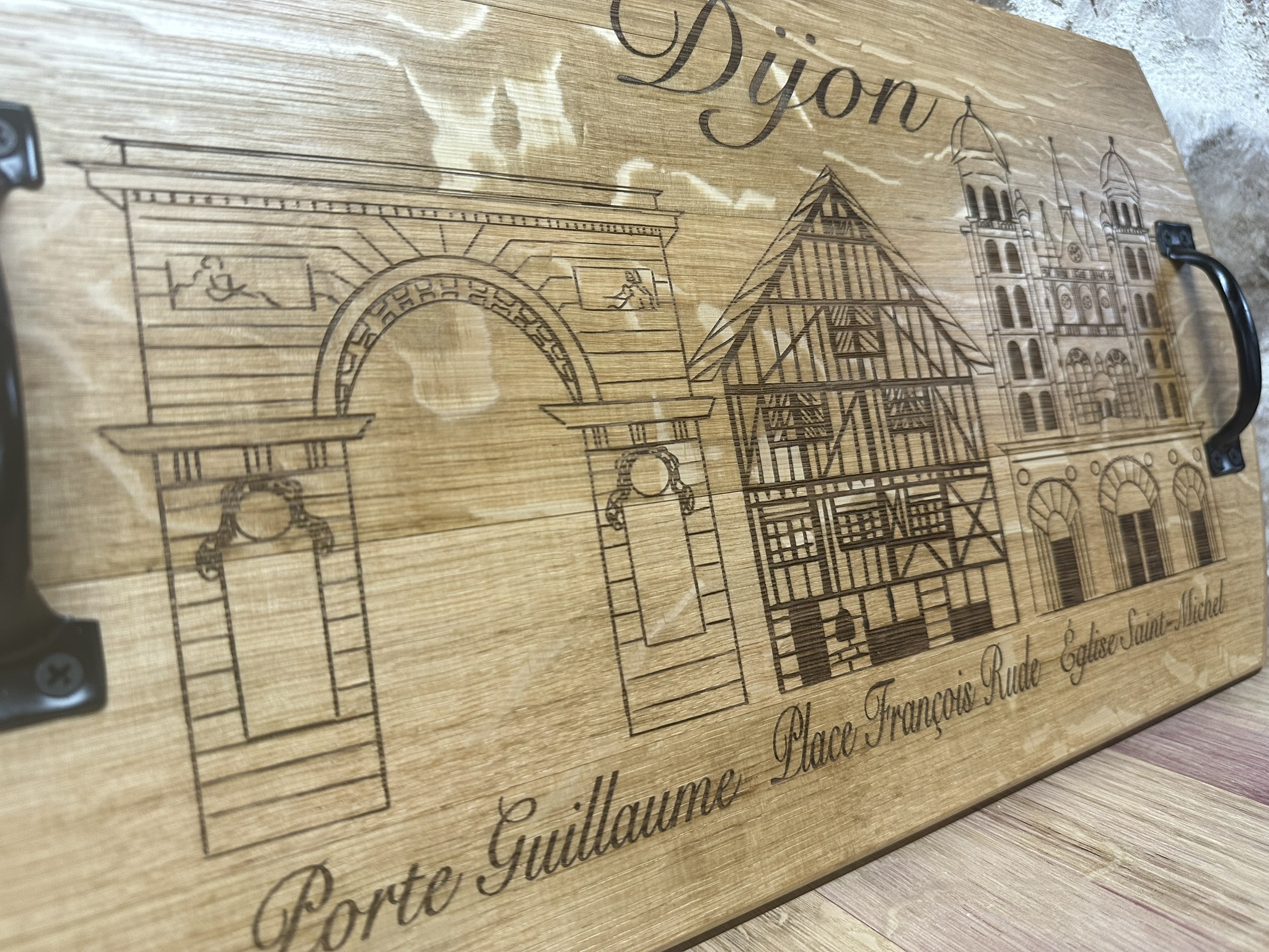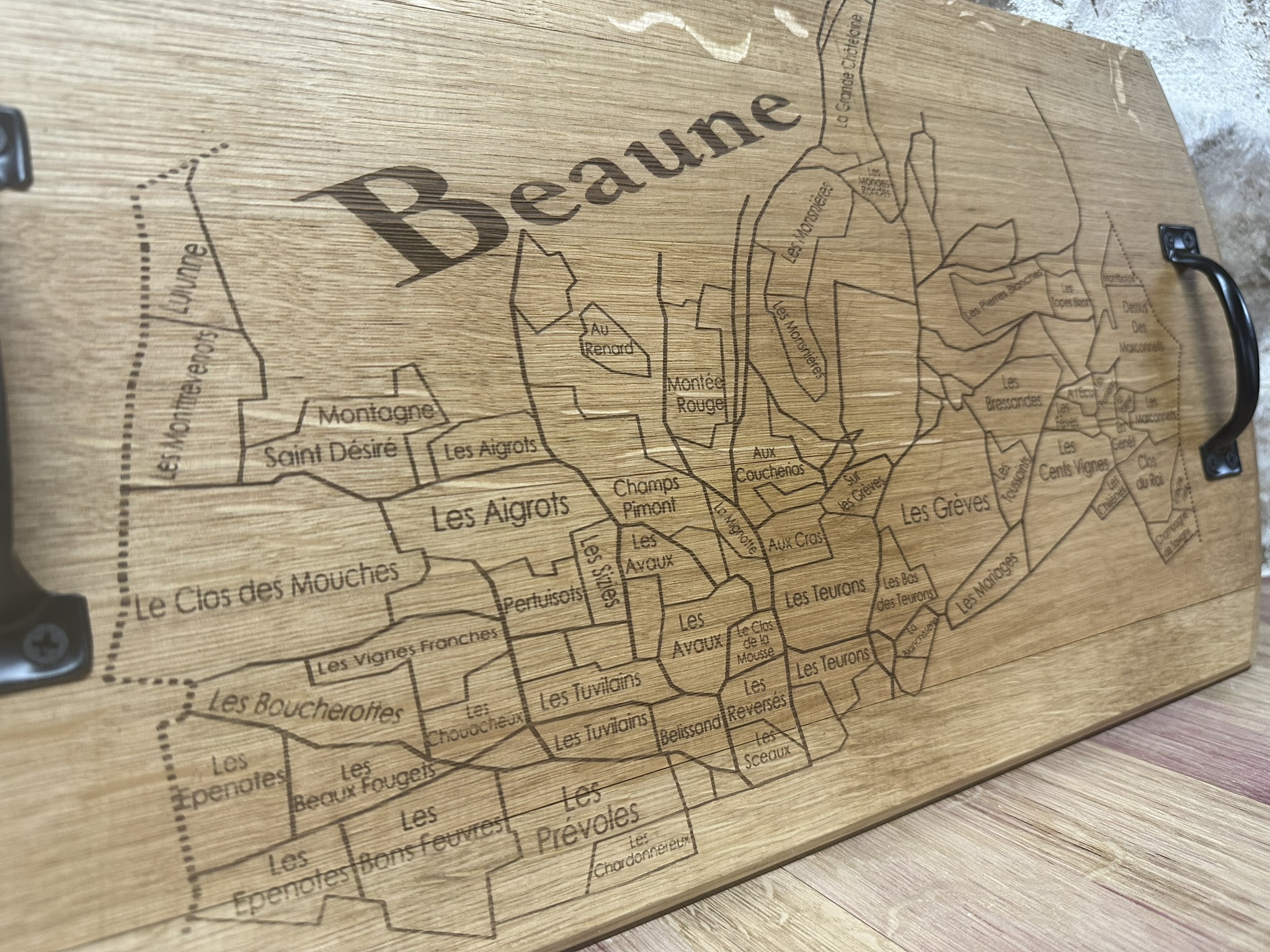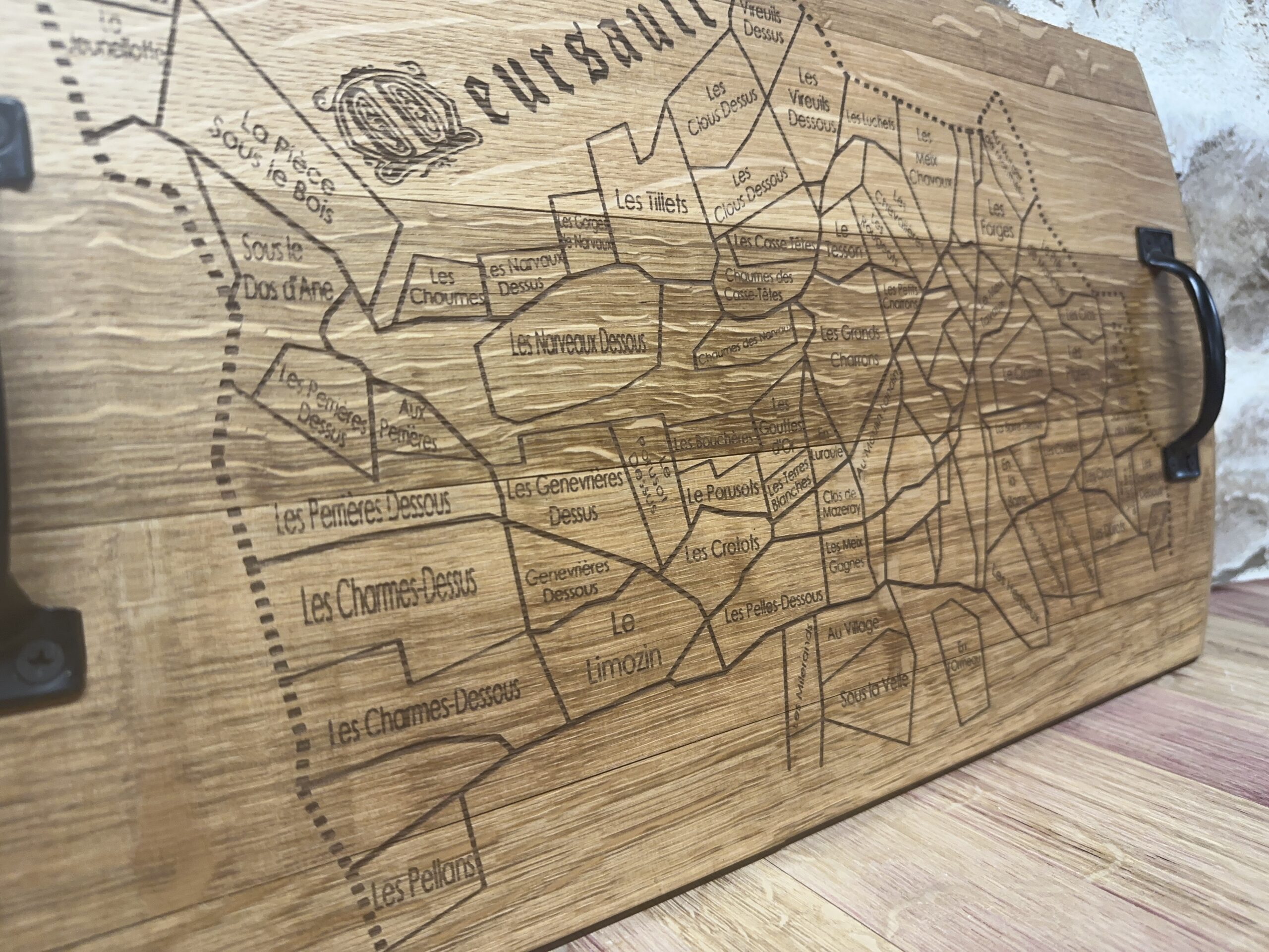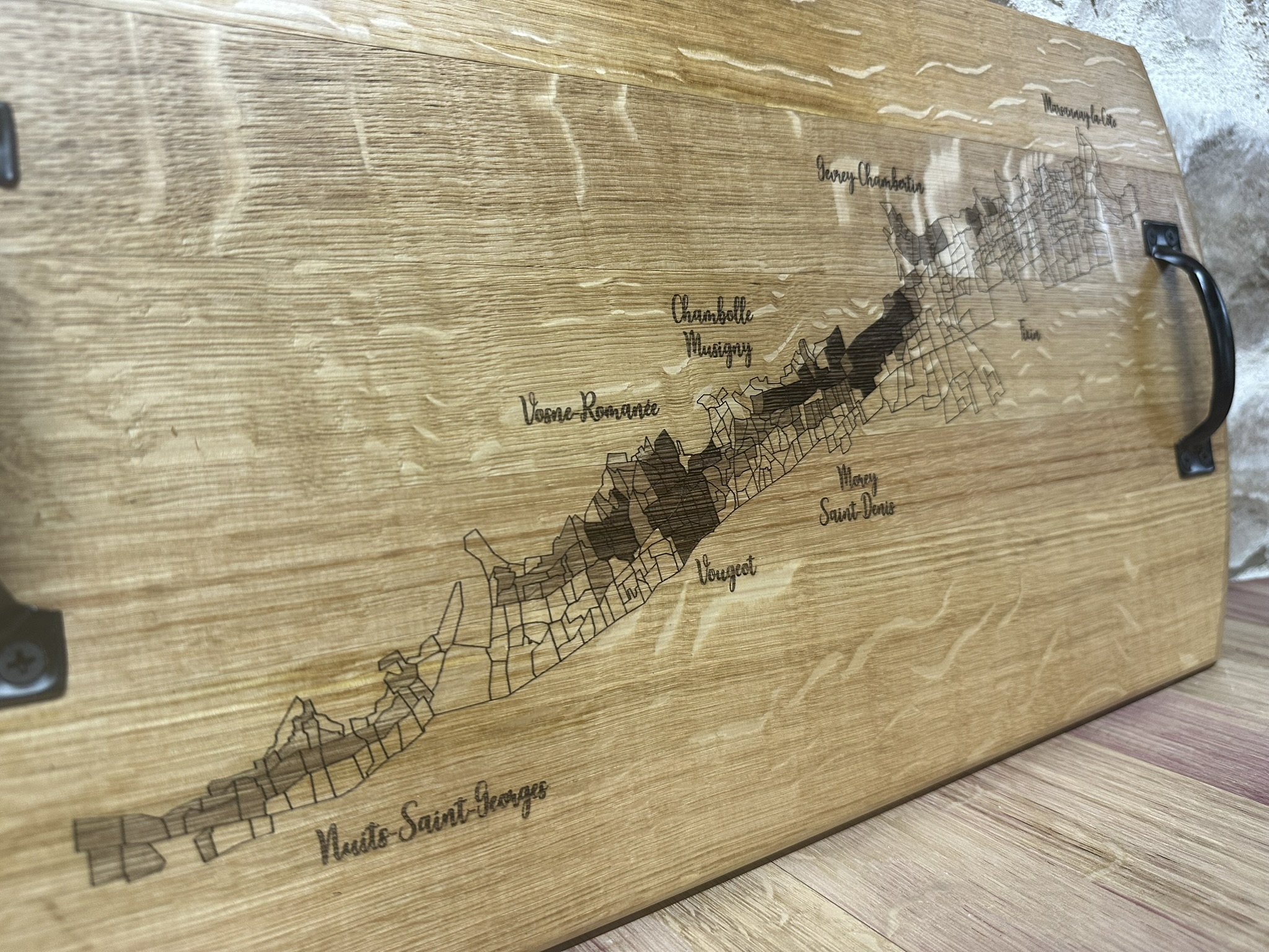 Ici, la planche XXL est entièrement réalisée en chêne à partir d’un fond de tonneau neuf. 60cm de long pour 30 de haut. 2 poignées métalliques pour assurer un bon maintien. Comme pour l’ensemble des produits proposés, la personnalisation est tout à fait possible, selon vos envies.